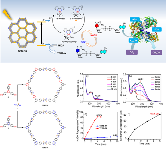 此前,李志波教授和赵英杰教授团队在研究全共轭共价有机框架材料时发现三嗪单元的引入能够赋予材料较高的光催化活性,这类材料在光催化NADH再生方面往往具有优异表现(Journal of the American Chemical Society, 2020, 142, 5958-5963)。最近,团队与高性能聚合物研究院丁乃秀教授、材料公司刘健教授合作,通过无催化剂添加的方法制备了噻唑并噻唑类共轭多孔聚合物TZTZ-TA和TZTZ-TP。其中,含三嗪结构单元的TZTZ-TA催化 NADH再生效率5分钟内即可达到82%。将TZTZ-TA与酶结合后能够实现二氧化碳到甲醇的高效和高选择性转变,甲醇浓度5分钟即可达到163.1 μM。该研究成果已经发表在一区期刊ACS Applied Materials & Interfaces上,题目为“Construction of Thiazolo[5,4-d]thiazole-based Two-Dimensional Network for Efficient Photocatalytic CO2 Reduction”,第一作者为王元成博士和博士生刘辉。