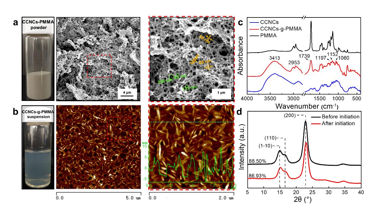 图2.(a) CCNC-PMMA粉体的照片和SEM图像;(b) CCNC-g-PMMA悬浮液的图像和AFM图像;(c) CCNC、PMMA和CCNC-g-PMMA的红外光谱;(d) CAN引发前后CCNC的XRD谱图。