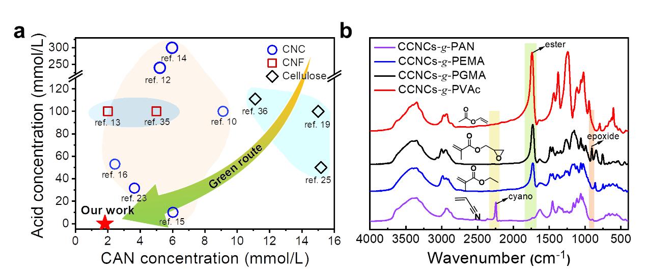 图4. (a)由CAN引发的纳米纤维素接枝聚合物改性的酸浓度和引发剂浓度与文献报道的比较;(b) CNCs-g-PAN、CNCs-g-PEMA、CNCs-g-PGMA和CNCs-g-PVAc样品的FTIR光谱。