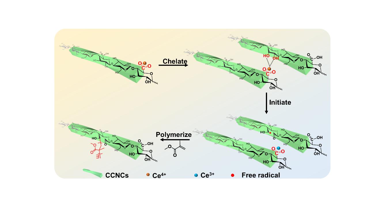 纳米纤维素表面存在可反应的羟基,可通过化学改性的方法改善CNCs的表面极性和热稳定性,赋予纳米纤维素不同的性质。硝酸铈铵(CAN)在水介质中引发接枝聚合是一种具有高度选择性的CNC接枝聚合物改性引发剂。然而,为了抑制CAN的水解,引发反应通常在强酸性条件下进行,强酸会造成严重的环境问题,限制可聚合的单体种类。为了解决这个问题,张建明团队将起引发作用的铈离子通过络合作用稳定在羧基化CNC(CCNC)表面,与CCNC共同组成“大分子引发剂”,成功实现了无酸条件下甲基丙烯酸甲酯(MMA)在CCNC表面的聚合,打破了CAN只能在强酸条件下引发接枝的限制,并拓宽了可接枝的聚合物种类。