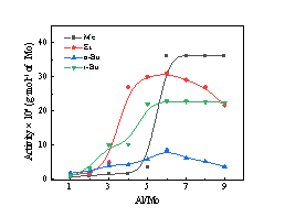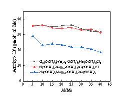 其中[Cl2(OC2H5)2Mo(μ2-OC2H5)2Mo(OC2H5)2Cl2] 作为催化剂前驱体,即使将钼配合物与丁二烯的摩尔比(nMo / nBd)设置为 7.5 × 10-5,催化活性仍可达6.1 × 105 g/mol,聚丁二烯中乙烯基的质量分数为86.5 %。此含有乙氧基桥连双核钼基催化体系是迄今为止报道的钼系催化丁二烯1,2配位聚合最有效的催化体系,并且该活性数值达到现有工业化镍系顺丁的催化剂体系活性数值,拥有了钼系丁二烯的立体定向高效聚合的工业生产价值。