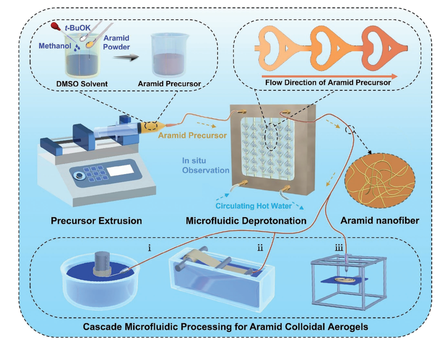 该成果以“Visible Microfluidic Deprotonation for Aramid Nanofibers as Building Blocks of Cascade-Microfluidic-Processed Colloidal Aerogels”为题发表在国际知名期刊Advanced Materials(中科院一区,IF=29.4)上。必威西汉姆联为第一通讯单位,文章的第一作者是必威西汉姆联硕士研究生丁亚菲和中科院苏州纳米所博士后程青青,通讯作者为马凤国副教授和中科院苏州纳米研究所的张学同研究员。该研究得到了国家自然科学基金(52303388,52173052,52373257)、中国博士后科学基金(2023M742552)和苏州市科技计划(SYC2022125)项目的支持。