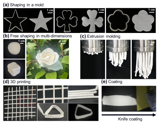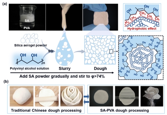 随着社会经济的快速发展和人民生活水平的提高,热管理问题越来越受到人们的关注。二氧化硅气凝胶(SA)是一种超轻且高度多孔的隔热材料,是热管理应用的绝佳选择。然而SA在复合过程中可能会出现气凝胶孔隙被聚合物破坏、浸润的情况,使气凝胶丧失隔热性。利用亲水性聚合物溶液的高粘度特性和其与疏水SA之间亲疏水性质的差异,在强外力搅拌的作用下,可以使气凝胶被聚合物分子链包覆,从而实现气凝胶良好分散的同时保留其孔隙结构。但是,由于SA颗粒的高比表面积和超低密度,将大量SA颗粒分散到其他基质中以制备优质隔热材料或填充母粒仍然具有挑战性。另外,SA及其复合材料在使用过程中的限制条件多,使用场景单一。在聚合物复合领域,面团状的复合材料由于其自身可塑的特点,可以很好的塑形契合各种场景的使用。