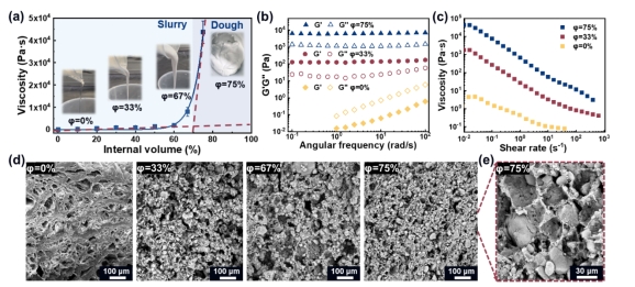 研究人员展示了一种分散74 vol%以上SA的高内相SA- PVA面团材料。先进的设计原理包括:(1)借助SA与PVA水溶液间的疏水相互作用保护SA的多孔结构,使SA孔径不被聚合物基质破坏。(2)利用乳液体系中的高内相结构进行设计,以PVA分子作“乳化剂”在水相中稳定SA颗粒,实现SA的高体积填充,SA的功能性得以完美继承。(3)高内相SA-PVA复合材料的高屈服应力克服自身重力影响,使材料展现出可塑的面团状态,这种状态大大拓宽了SA/PVA复合材料的应用范围。基于此,SA-PVA面团展现了优异的保温隔氧性能与成型能力,在食品低温保鲜领域具有重大潜力。