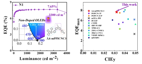 在此工作的基础上,该团队提出了一种新颖的给体′-给体-受体(D′–D–A)型分子策略,采用N-烷基咔唑为给体桥、氰基苯为受体、菲并咪唑为第二给体,通过精确分子构型工程调控,实现了兼具高荧光效率和平衡双极传输的NUV HLCT材料以及高效率且低滚降的非掺杂OLED器件。研究发现,平面化分子内电荷转移(PLICT)特性赋予了该系列分子在溶液和纯膜态的高发光效率。其中,分子3,6-mPPICNC3因空间位阻和弱共轭效应在聚集状态下保持着NUV发射和高色纯度。同时,其在不同电场中均具有相对平衡的空穴和电子迁移率。基于这一荧光材料的非掺杂器件实现了高达7.67%的EQE,并在0至3300 cd m-2的亮度范围内效率滚降可忽略不计。该器件光谱的半峰宽为44 nm,CIE色坐标为(0.160,0.032)。这一性能在目前已报道的非掺杂NUV-OLED中位于前列。此外,其掺杂器件也具有出色电致发光性能,EQE高达7.85%,发射峰为391 nm,半峰宽为41 nm,对应的CIE色坐标为(0.161,0.025)。该工作充分证明了D′–D–A型分子结构在开发高性能有机发光材料及其光电子应用方面具有巨大潜力。相关工作以“A record-high EQE of 7.65%@3300 cd m−2 achieved in non-doped near-ultraviolet OLEDs based on novel D′–D–A type bipolar fluorophores upon molecular configuration engineering”为题,发表在英国皇家化学会旗舰期刊Chemical Science上(DOI: 10.1039/D4SC02655A)。