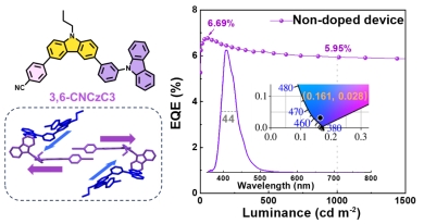 近紫外(NUV)有机发光二极管(OLED)在防伪、紫外固化、激发光源、医学诊疗、杀菌消毒等领域具有重要应用前景。然而,因其固有的宽带隙特点,NUV有机电致发光材料通常存在低荧光效率和载流子注入与传输不平衡等问题,导致NUV-OLED器件效率偏低且在高电流密度下存在严重的效率滚降。尤其在简单结构的非掺杂NUV-OLED器件中,NUV材料的载流子注入与传输问题对器件性能影响更为显著。