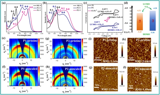 Figure 2. (a) UV-vis absorption spectrum of P1 and (b) P2 in chloroform solution and thin film state; (c) cyclic voltammograms of the polymers as thin films deposited on ITO electrolyte: 0.1 M TBAPF6/acetonitrile. Potential calculated versus ferrocene. Scan rate:100 mV s-1; T = 20 ℃; (d) energy level diagram of both polymers. HOMO and LUMO values were calculated according to the equation –ELUMO = Eonset(reduction) + 4.8 eV, and –EHOMO = Eonset(oxidation) + 4.8 eV. Eonset(oxidation) and Eonset(reduction) are onset potentials for oxidation and reduction processes vs Fc/Fc+ couple; (e)-(h) 2D-GIWAXS images of both polymers (P1 and P2) thin films before and after thermal annealing at 150 ℃ for 10 min; (i)-(l) AFM images of both polymers (P1 and P2) thin films before and after thermal annealing at 150 ℃ for 10 min.