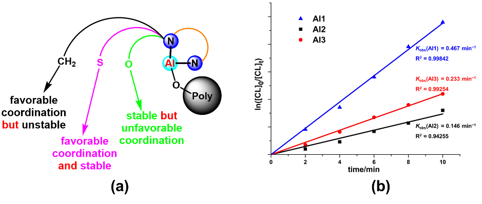 图3. Al1−Al3的配位能力和稳定性的比较(a)以及催化ε-CL开环聚合的动力学(b)