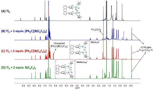 为了更清楚地探究双金属之间的协同作用,作者通过原位核磁研究了双金属催化剂Ti2与不同用量(1或者2当量)、不同种类助催化剂( [Ph3C][B(C6F5)4]或者B(C6F5)3)的活化反应。研究发现,Ti2在各种条件下,均得到一种独特的甲基桥联单阳离子结构活性种(图2)。这一结果说明了双金属催化剂Ti2的两个金属中心能够共同作用或协同作用,因而表现出更优异的烯烃聚合催化性能。