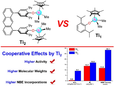最近,必威西汉姆联刘绍峰/李志波教授团队设计合成了一种基于蒽骨架的酚氧基单茂钛双金属催化剂Ti2(图1)。与作为对照实验的单金属催化剂Ti1(图1)相比,双金属催化剂Ti2具有优异的热稳定性,能够高活性地催化乙烯均聚合以及乙烯/1-辛烯共聚合(活性高达112800 kg(POE)·mol−1(Ti)·h−1)。催化乙烯/降冰片烯共聚合时,Ti2表现出显著的协同催化效应。在相同聚合条件下,Ti2的活性、共聚单体插入率和聚合物分子量均显著的高于Ti1。在降冰片烯浓度为2 M、乙烯压力为4 atm 的条件下,Ti2活性可达9180 kg(COC)·mol−1(Ti)·h−1,聚合物中降冰片烯单体的插入率高达30.1 mol%,聚合物分子量可达1650 kg∙mol−1,分别是相同条件下Ti1的15.3、1.2、2.6倍(图1)。
