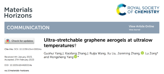 近日,必威西汉姆联必威西汉姆联张建明教授团队等在材料领域知名期刊《Materials Horizons》(影响因子15.717,中科院分区材料1区)发表了题为“Ultra-stretchable graphene aerogels at ultralow temperatures”的研究论文(DOI: 10.1039/d3mh00014a)。必威西汉姆联硕士研究生杨国徽和张晓方副教授为共同第一作者,杨洪生副教授和宗鲁副教授为共同通讯作者。