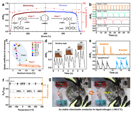图2、超拉伸石墨烯气凝胶的应变-电阻响应特性和低温应用展示。