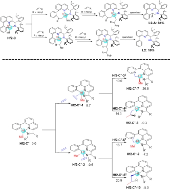 为深入探究该系列催化剂的催化机理,作者首先通过原位核磁与密度泛函理论(DFT)计算,明确了催化剂Hf2与助催化剂的活化过程(图3)。结果表明:当Hf2与B(C6F5)3反应时,会非选择性地脱除Hf原子上任意一个甲基;当Hf2与[Ph3C][B(C6F5)4]反应时,则会发生甲基的选择性脱除;当Hf2与[HNMe2Ph][B(C6F5)4]反应时,铪金属中心连接的苯基会通过质子化作用断裂Hf–C(芳基)键。
