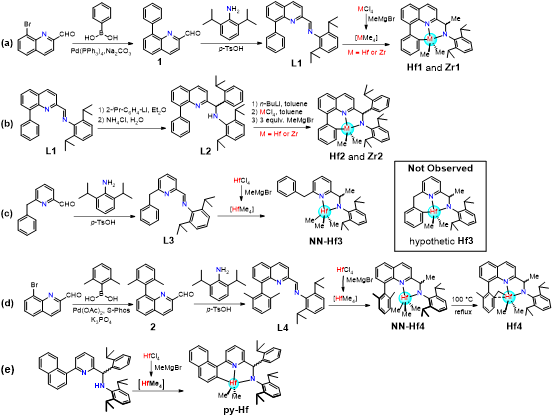 作者通过以下方法(图2),合成了一系列CNN三齿配位的新型金属催化剂。所得新型铪(Hf1、Hf2、Hf4)、锆(Zr1、Zr2)催化剂在乙烯均聚中表现出高热稳定性和高活性,且得到的聚合物具有较高分子量。例如:Hf2在80 °C时活性高达13350 kg(PE)·mol-1(M)·h-1,且聚合物分子量高达106×104 g∙mol−1。同时,乙烯与1-辛烯的共聚结果表明,该类催化剂对1-辛烯的插入率极低(< 0.3 mol%),其中Hf2的1-辛烯插入率甚至低于0.1 mol%。这一结果与陶氏化学报道的py-Hf催化剂截然不同。