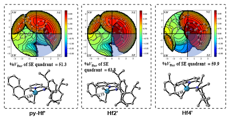 作者还采用包埋体积计算揭示了该类催化剂共聚效果较差这一反常现象(图5)。结果表明,与Hf2’(%VBur = 63.8)和Hf4’(%VBur = 59.9)相比,py-Hf’在单体插入区域的包埋体积(%VBur = 51.3)显著更小。这表明,Hf2和Hf4中较大的空间位阻阻碍了1-辛烯等大位阻烯烃单体的配位插入,从而降低了1-辛烯单体的共聚能力。