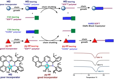 鉴于Hf2在共聚反应中对乙烯的高活性、极低的1-辛烯共聚性能,以及优异的链转移潜力,作者将其与py-Hf联用,在链转移剂ZnEt2的存在下通过链穿梭聚合成功制备了高熔点(Tm高达130℃)的烯烃嵌段共聚物(图6)。