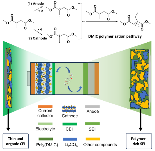 在全球气候危机与能源转型的双重挑战下,锂离子电池作为清洁能源存储的核心组件,其环保性能日益受到关注。传统电解液添加剂多依赖化石原料,不仅存在资源枯竭风险,生产过程中还可能产生环境负担。如今,生物基电解液添加剂的突破性发展为解决这一困境提供了绿色解决方案,必威西汉姆联王庆富教授、孙靖江博士研究团队进行了衣康酸二甲酯作为锂离子电池添加剂的创新研究。衣康酸二甲酯在电池中能够促进坚固的富含聚合物的SEI和CEI层的形成,这种富含聚合物的SEI和CEI层可以起到缓冲体积变化的作用,显著提高电化学稳定性,优化Li+传输动力学。衣康酸二甲酯其不仅具备卓越的电化学性能,更能显著降低电池产业的环境足迹,为可持续能源未来铺平道路。
