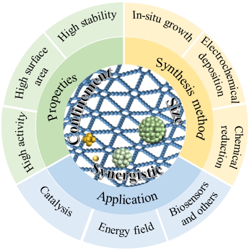 综述系统梳理了石墨炔(GDY)及其衍生物基复合材料的分类、合成方法、应用场景与发展挑战,核心聚焦 GDY 作为亚稳态颗粒稳定剂的独特价值。GDY 兼具 sp-sp2 共轭结构、丰富均匀的孔洞、可调带隙及二维平面特性,其富含的炔键不仅能高效吸附金属原子、负载金属物种,还可显著降低金属颗粒表面能。与负载物相互作用时,GDY 会产生协同效应、限域效应与尺寸效应,这些特性共同赋予其优异的载体性能,使其成为构筑高性能复合材料的理想基底。GDY 的合成条件温和,不仅赋予其优异的结构可调性,还为其后续的掺杂改性与功能化修饰创造了有利条件,因此衍生物通过官能团取代(如氟、甲基)或杂原子掺杂(氮、硫、硼)调控电子结构与表面特性,极大的拓展了GDY的应用领域。团队创新性地按金属负载尺寸将石墨炔基复合材料分为单原子、纳米簇和纳米颗粒三类,三类材料各具结构优势,覆盖了不同尺度的应用需求。在合成技术方面,综述详细介绍了原位生长法、电化学沉积法、还原法等主流制备路径,这些多样化的合成策略为复合材料的性能定制提供了技术支撑。该类复合材料已在多个领域展现出广阔应用前景,文中详细介绍了在催化、能源、生物医学等领域的重大进展。论文同时指出,当前石墨炔基复合材料仍面临高质量合成难度大、层间剥离困难、规模化生产受限等挑战。未来需通过提升材料结构规整性、创新合成方法、拓展复合体系等方向实现突破。