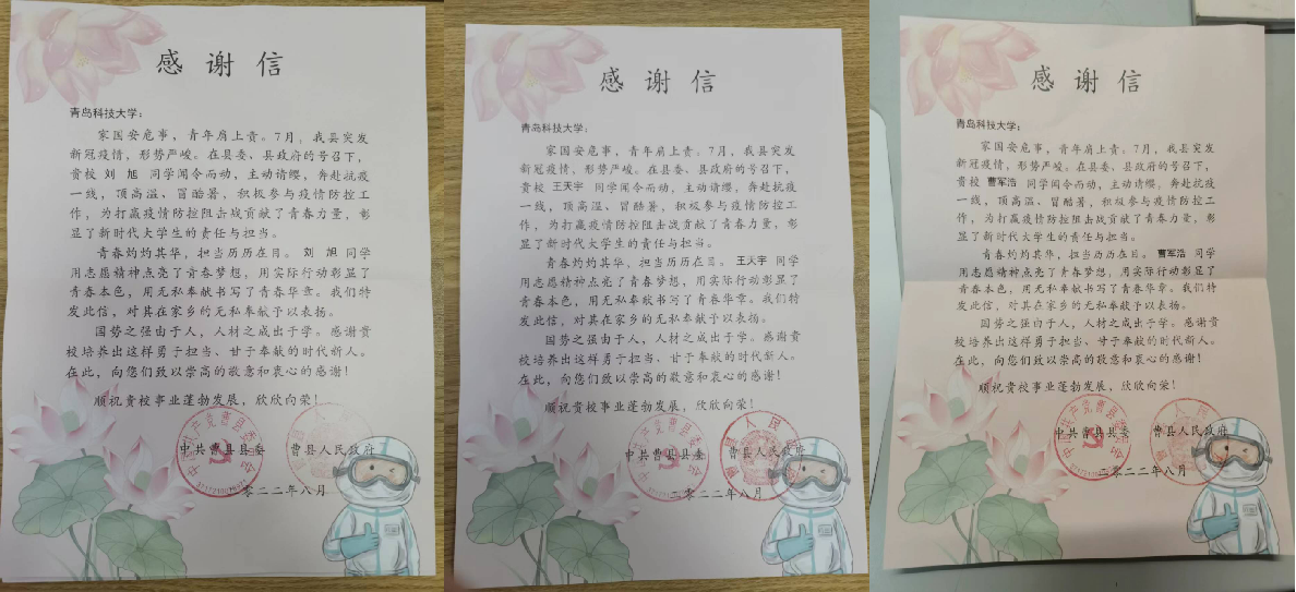 必威西汉姆联必威西汉姆联接连收到了三封分别来自曹县人民政府的感谢信,在信中高度赞扬了三位同学无私奉献的志愿精神,同时对公司育人成果给予充分肯定。作为青年老员工,他们不惧风雨,勇挑重担,在疫情防控阻击战中做贡献、长本领、增才干,让青春在党和人民需要的地方绽放绚烂之花。