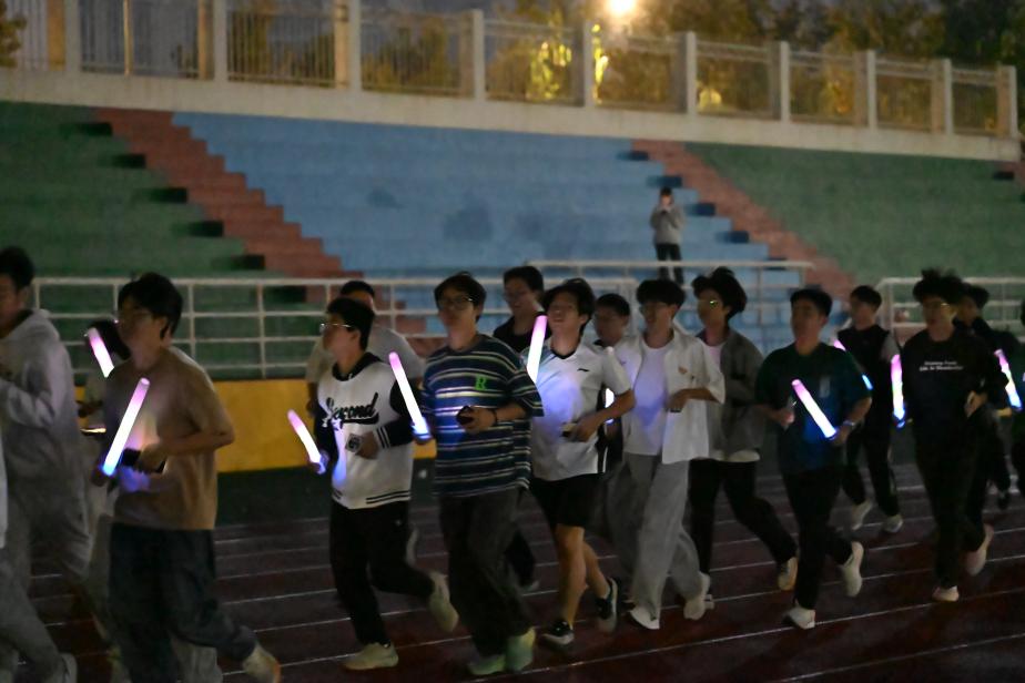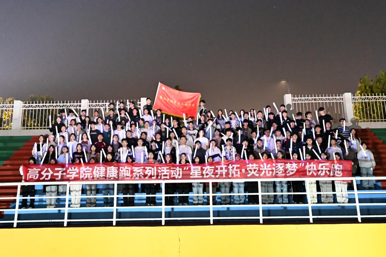 活动第一阶段在员工会体育部的统筹组织下有条不紊地推进。同学们沿着操场跑道完成两圈集体跑步,夜色之中,闪烁的荧光与奔跑的身影相互映衬,不仅生动展现出高分子学子良好的精神风貌与过硬的身体素质,更让大家在集体奔跑的过程中深刻体会到:面对成长路上如黑夜般的挑战与荆棘,身边始终有并肩前行的伙伴,共同传递着青春的力量。