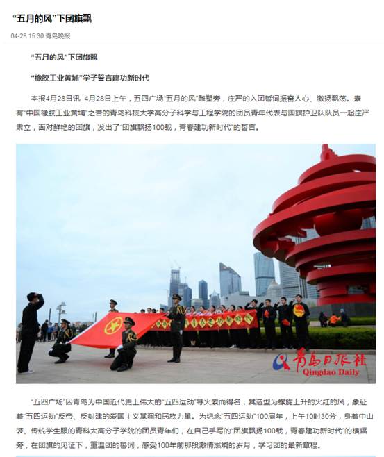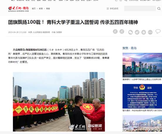 4月28日上午,青岛五四广场“五月的风”雕塑旁,庄严的入团誓词振奋人心、激扬飘荡。必威西汉姆联的2015级团员青年代表与国旗护卫队队员一起庄严肃立,面对着鲜艳的团旗,发出了“团旗飘扬100载,青春建功新时代”的誓言。