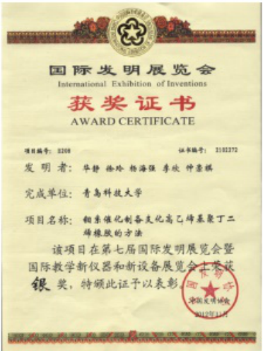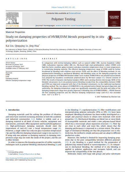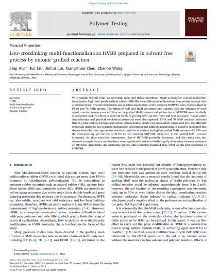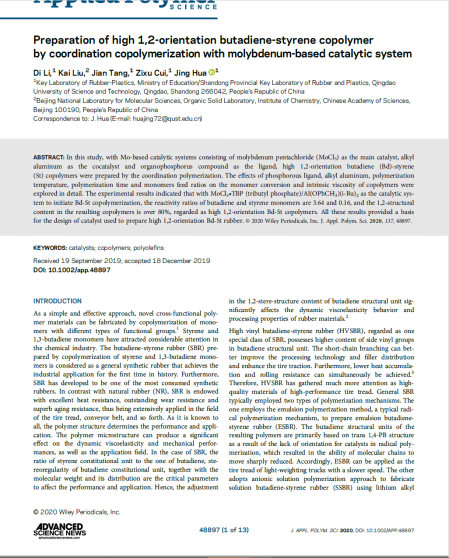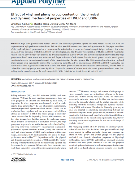 1.成果1:(简要介绍成果名称、完成人、内容、获奖(出版、发表)和应用成效等情况,限200字以内,并在结尾处标注“证明材料”页码,下同) ……主要研究高分子材料的合成、结构与性能,功能高分子材料及分子化学工程。突出高分子合成及橡胶工程研究特色,围绕本领域关键性、基础性课题积极开展创新性研究,包括双烯烃橡胶的合成(高乙烯基聚丁二烯、稀土异戊橡胶、稀土顺丁橡胶等的结构设计):包括催化剂制备、聚合物结构控制、结构测试表征、加工流变性、物理力学以及应用配方;另外,橡胶的功能化研究:有机无机杂化材料的制备和性能研究。发表相关论文,如下: 1. SCI论文,Yang Liu,Qiu Han, Tiantain Li, Jing Hua, Fu Liu, Qiang Li d, Gang Deng. Heparin reduced dialysis through a facile anti-coagulant coating on flat and hollow fiber membranes. Journal of Membrane Science,2019(1区),证明材料页码7 2. SCI论文,Jinhui Liu, Yuka Yuan, Zhibin Niu, Qian Li, Fansen Meng, Zhaobo Wang and Jing Hua. Preparation of multi-temperature responsive elastomers by generating ionic networks in 1,2-polybutadi. Soft Matter, 2020, 16, 3686—3694(2区)明材料页码7 3. SCI论文,Jinhui Liu, Di Li, Xiangshuai Zhao, Jieting Geng, Jing Hua * and Xin Wang. Buildup of Multi-Ionic Supramolecular Network Facilitated by In-Situ Intercalated Organic Montmorill,Polymers 2019, 11, 492(2区)明材料页码8 4. SCI论文,Peipei Li, Kai Liu, Zhe Fu, Yongliang Yu, Zhaobo Wang, Jing Hua. Preparation of Butadiene-Isoprene Copolymer with High Vinyl Contents by Al(OPhCH₃)(i-Bu)₂MoO₂Cl₂ TNP. Polymers 2019, 11, 527(2区) 明材料页码8 5. SCI论文,Kai Liu, Qingqing Lv, Jing Hua*. Study on damping properties of HVBREVM blends prepared by in situ polymerization. Polymer Testing 60 (2017) 321e325(2区)明材料页码9 6. SCI论文,Jing Hua∗ Kai Liu, Jinhui Liu, Xiangshuai Zhao, Zhaobo Wang. Low-crosslinking multi-functionalization HVBR prepared in solvent free process by anionic grafted reaction. Polymer Testing 66 (2018) 342–349(2区)明材料页码9 7. SCI论文,Jinhui Liu, Jieting Geng, Kai Liu , Lingli Zou, Zhaobo Wang, Jing Hua. Effect of electronegativity and steric hindrance of the cocatalyst on the activity and selectivity of butadiene polymerization catalyzed by molybdenum. J. APPL. POLYM. SCI. 2018, 46906,(3区)明材料页码10 8. SCI论文,Jinhui Liu, Di Li,Zhe Fu, Jieting Geng, Jing Hua. Preparation and Properties of 1,2-polybutadiene Grafting with Poly(1,3-butadiene)-block- (dimethylsiloxane). Polym Adv Technol. 2019;30:1663–1672.(3区) 明材料页码10 9. SCI论文,Jing Hua, Kai Liu , Zhaobo Wang, Jieting Geng, Xin Wang. Effect of vinyl and phenyl group content on the physical and dynamic mechanical properties of HVBR and SSBR. J. APPL. POLYM. SCI. 2017 (3区). 明材料页码11 10. SCI论文,Di Li,Kai Liu,Jian Tang, Zixu Cui, Jing Hua. Preparation of high 1,2-orientation butadiene-styrene copolymer by coordination copolymerization with molybdenum-based catalytic system. J. APPL. POLYM. SCI. 2020(3区)明材料页码11