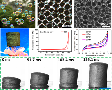 图2空气泡模板结合常压干燥技术制备的具有各向同性孔结构的石墨烯气凝胶,及其超轻、超可压缩回弹及耐疲劳性能。