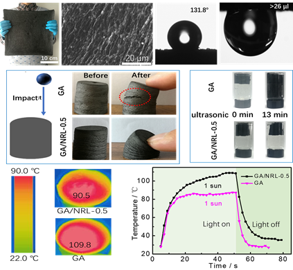 图1大块天然胶乳/石墨烯气凝胶图片,其类玫瑰花表面的微观结构以及疏水但粘附水滴性能。加入天然胶乳之后其具有优异的抗冲击、超声破坏以及快速光热转化能力。