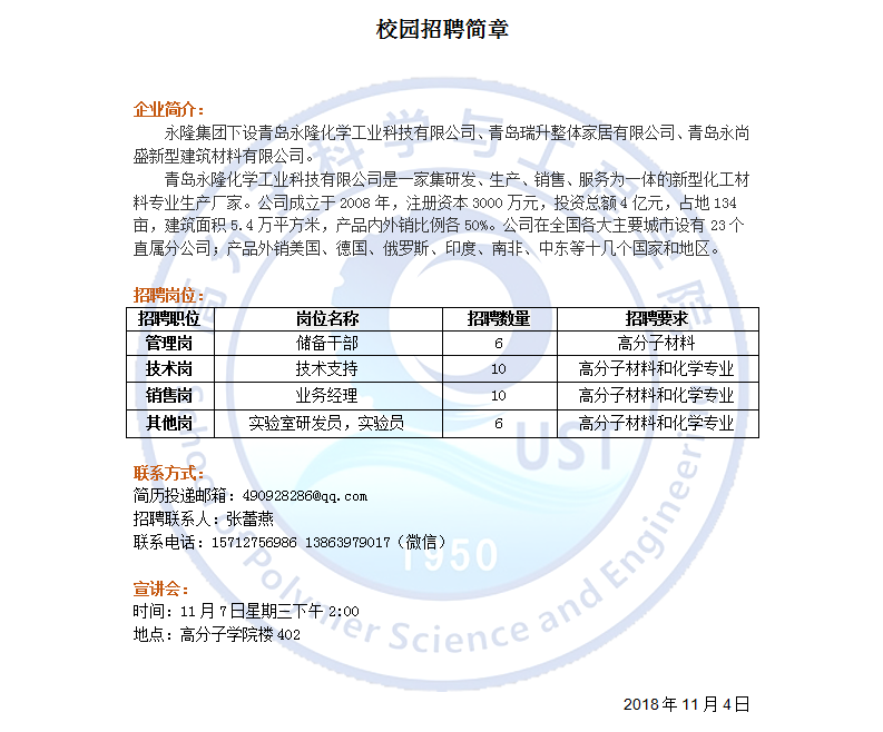 青岛永隆化学工业科技有限公司-2019高分子招聘之三十