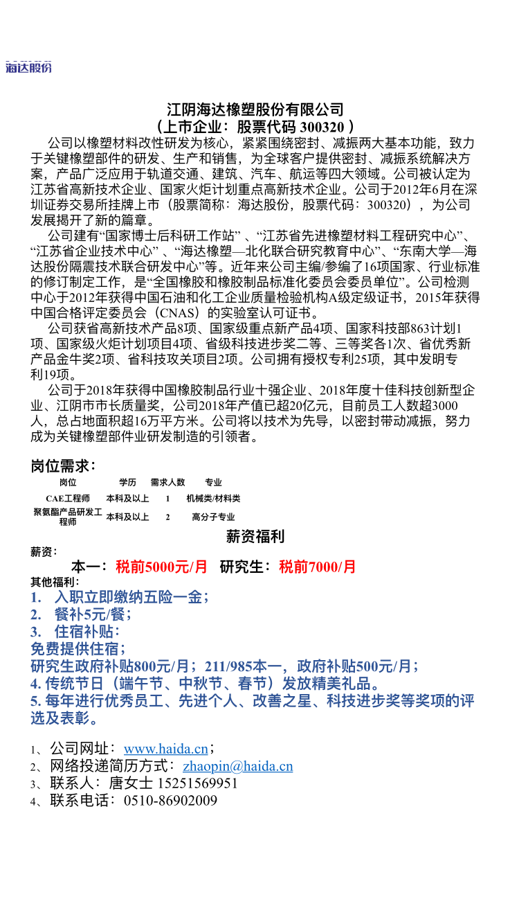 江阴海达橡塑股份有限公司-2020高分子招聘之七十五