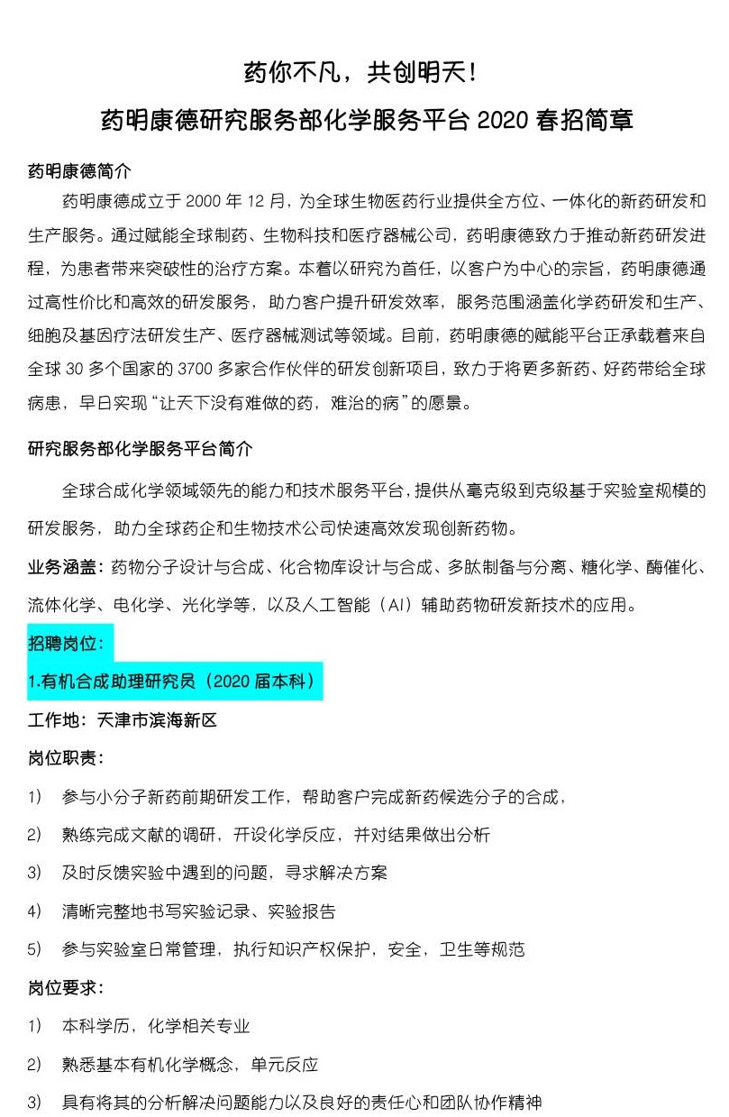 天津药明康德新药开发有限公司-2020高分子招聘之二百一十五