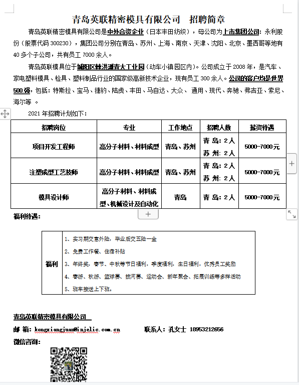 【就业信息】青岛英联精密模具有限公司招聘简章