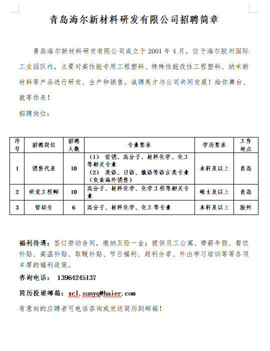 【就业信息】海尔新材料招聘简章