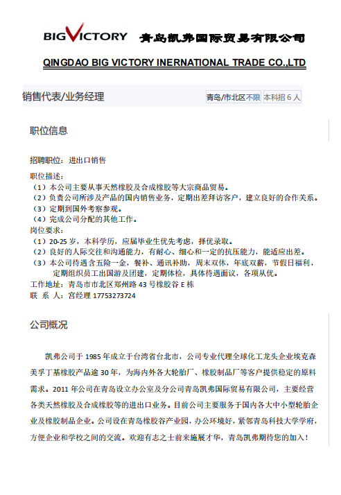 【就业信息】凯弗国际贸易有限公司招聘简章