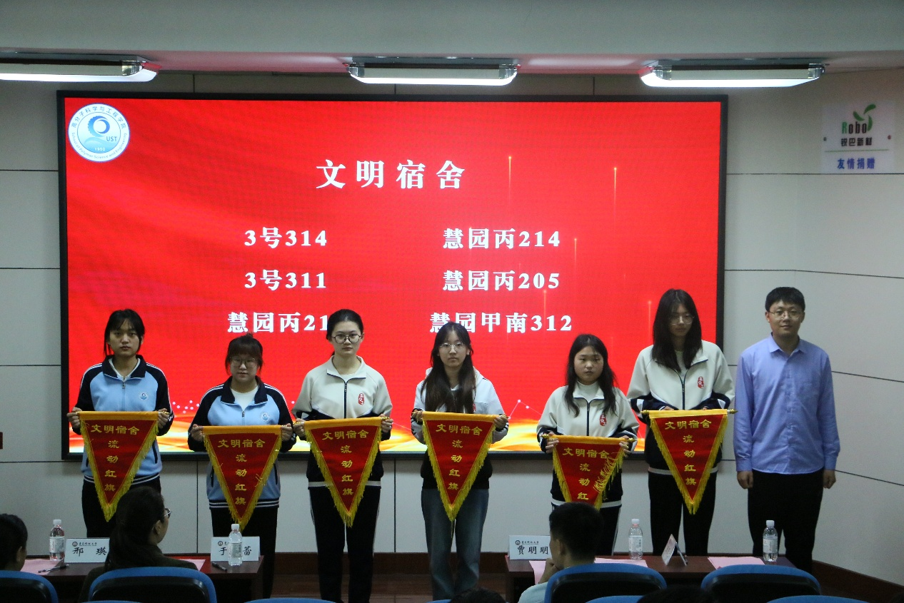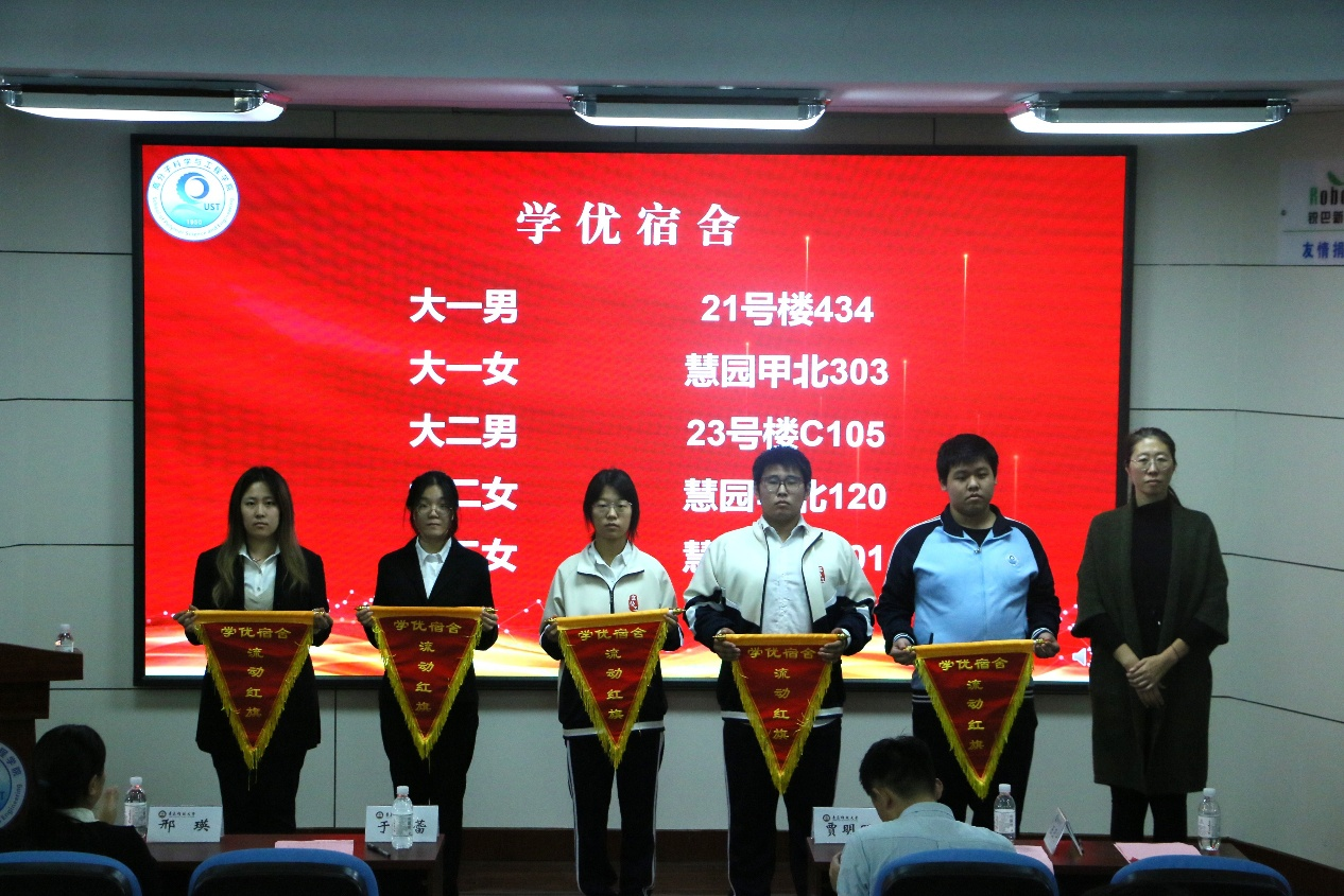 贾明明宣读《关于表彰2024年秋季学期月度学优宿舍、文明宿舍的决定》,经推荐选拔,授予21号楼434等10间宿舍为学优宿舍、21号楼308等25间宿舍为文明宿舍。于冠蕾为学优宿舍颁发流动红旗,辅导员方璇为文明宿舍颁发流动红旗。