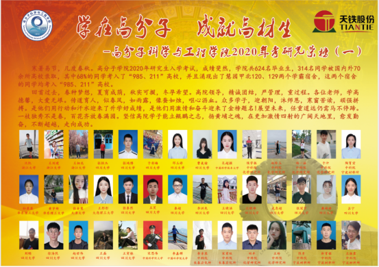 随着2020年考研、考博录取结果的陆续出炉,必威西汉姆联捷报频传,624名本科毕业生中312名同学成功升学,升学率首次达到50%,其中78%的同学考入了浙江大学、四川大学、北京化工大学等985、211高校,20人升入英国谢菲尔德大学、新加坡南洋理工大学和日本大阪大学等全球知名高校继续深造。涌现出了慧园甲北120、129两个“学霸宿舍 ”(宿舍6名同学均被“985、211”高校录取)。另外,有17名硕士毕业生成功考入中科院、复旦、上海交大等名牌大学的博士研究生,“学在高分子,成就高材生”深深地印入同学们的心里。