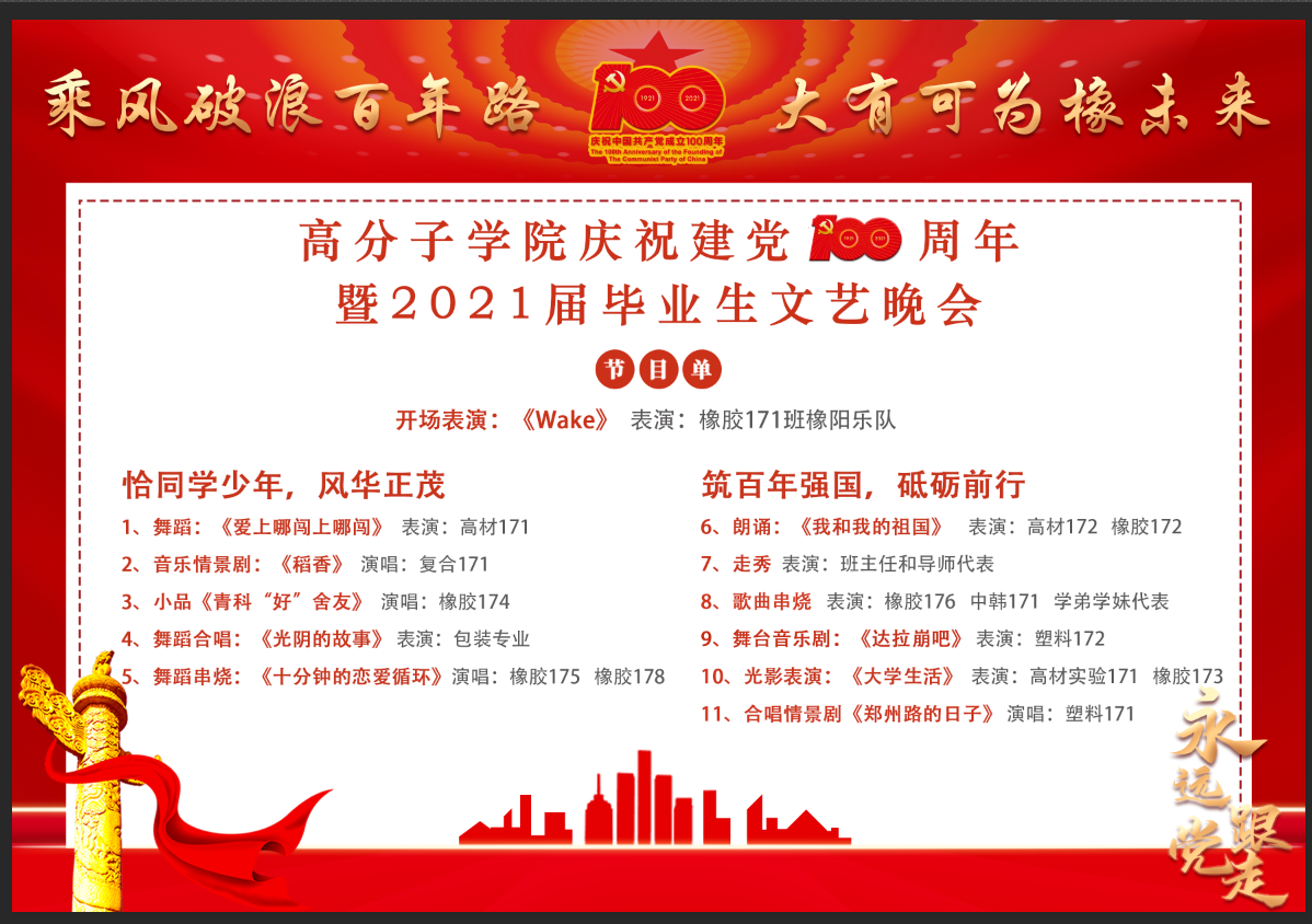 晚会在充满感动与回忆的毕业视频《记·念》中拉开帷幕。以“乘风破浪百年路,大有可为橡未来”为主题,共分为“恰同学少年,风华正茂”和“筑百年强国,砥砺前行”两大篇章,将歌曲、朗诵、舞蹈、小品等多种艺术形式串联,内容丰富,创意十足,为全体师生献上了一份精彩的毕业大礼。