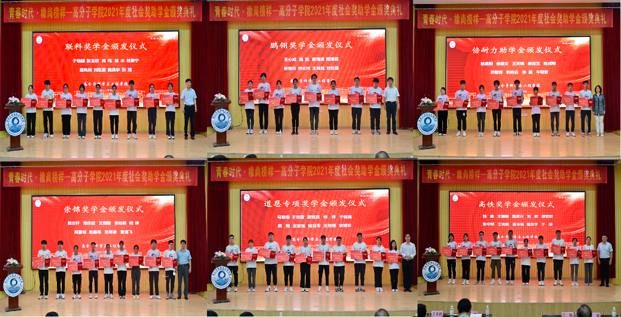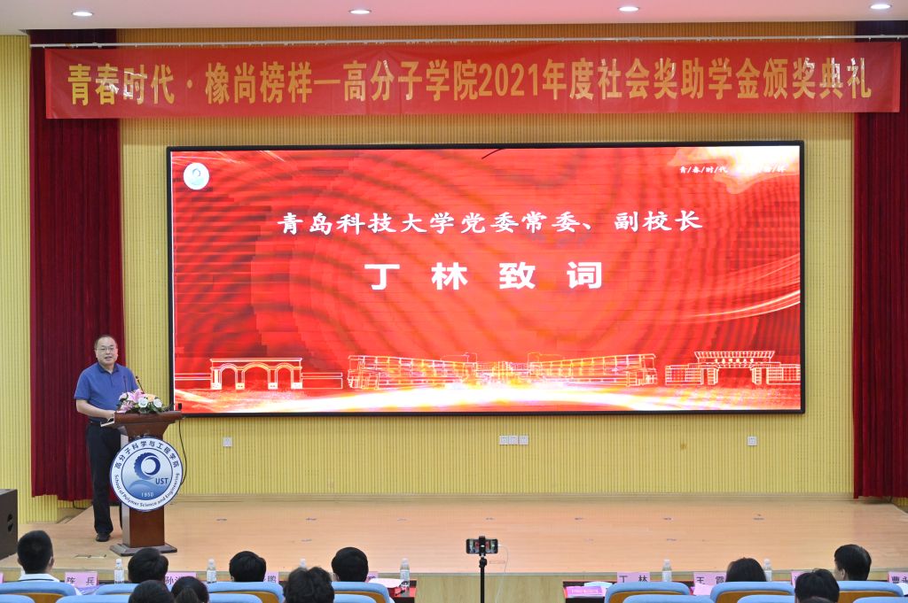 公司党委书记孙洪广为2021年度设奖、助学金单位代表颁发捐赠证书和奖杯。公司副经理王庆富宣读《关于表彰2021年度社会奖、助学金获得者的决定》;奖助学金捐赠企业代表和公司、公司领导一起为获奖员工颁发了获奖证书;企业代表高铁检测仪器(东莞)有限公司技术总监王鹏、江阴海达橡塑股份有限公司总工程师贡健、道恩集团有限公司人力资源部副部长战福东进行了交流讲话;获奖员工代表杜雅宁同学做了发言。