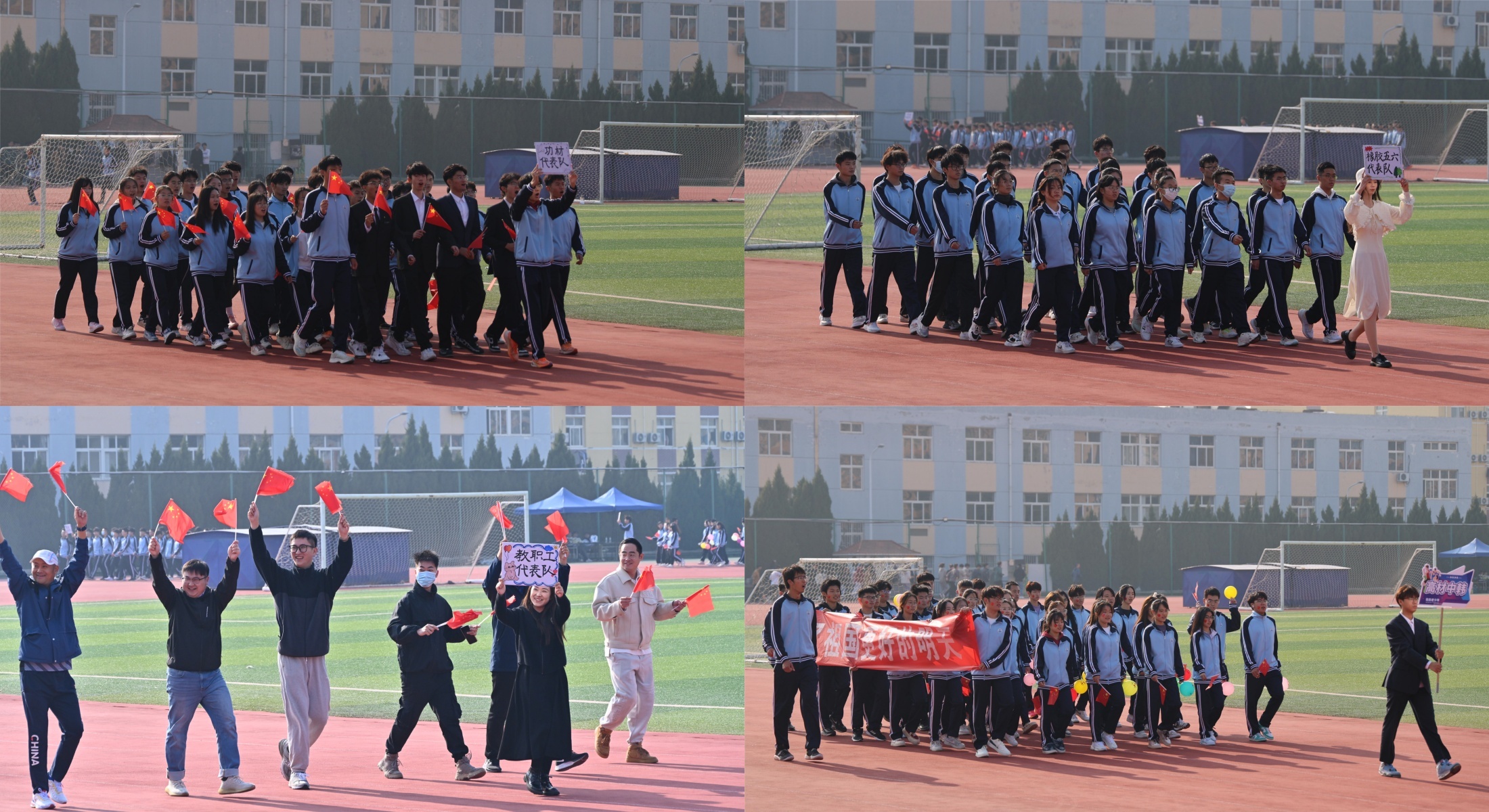 由师生共同组成的12个方队在《运动员进行曲》中陆续入场,整齐划一的步伐、掷地有声的口号,充分展示了高院师生蓬勃昂扬的精神面貌。入场式结束后,伴随着庄严的国歌声,全体师生起立奏唱国歌。