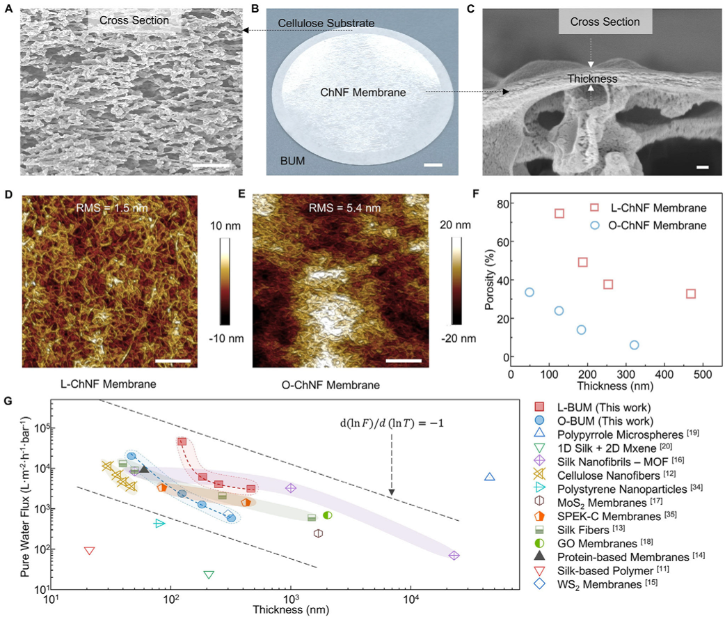 A–C) 纤维素支撑体的横截面 SEM 图像 (A; 比例尺, 10 μm);由纤维素支撑体和 ChNF 膜组装的 BUM 的照片 (B; 比例尺, 0.5 cm);ChNF 膜的横截面 SEM 图像 (C; 比例尺, 100 nm)。D,E) L-ChNF 膜 D) 和 O-ChNF 膜 E) 的 AFM 图像 (比例尺, 200 nm)。F) L-ChNF 和 O-ChNF 膜的厚度和孔隙率之间的关系。G) 本工作中的 BUFs 与其他报道的薄过滤器的纯水通量比较。