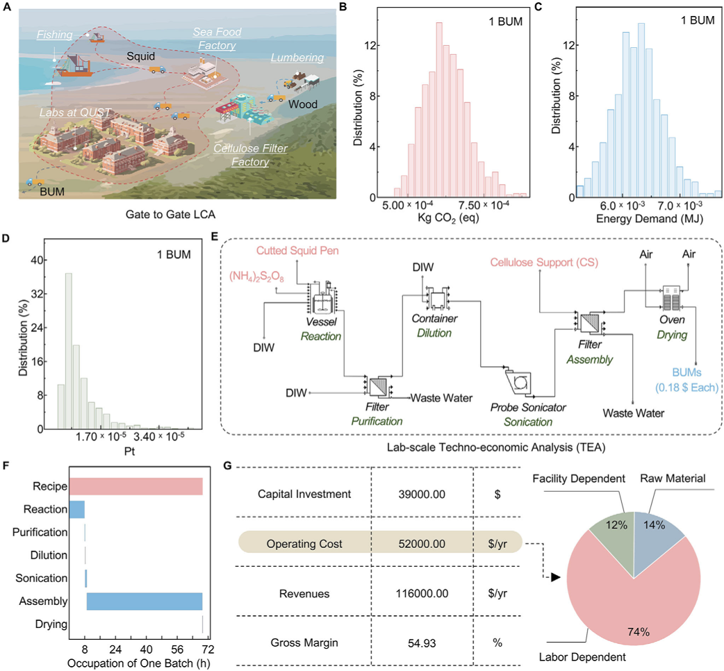A) 从门到门(红色虚线,系统边界)生命周期评估 (LCA) 的示意图,用于 1 个产品(1 片 BUM)。B–D) 碳足迹 B)、能源需求 C) 和环境损害潜力 D) 的不确定性分析。E) 实验室规模 BUF 生产的 TEA 建模的示意图工作流程。F) 单批次 BUF 生产期间的设备占用(从 6 g SPW 到 14 000 片 BUMs)。G) BUM 生产的经济评估报告 (EER)。