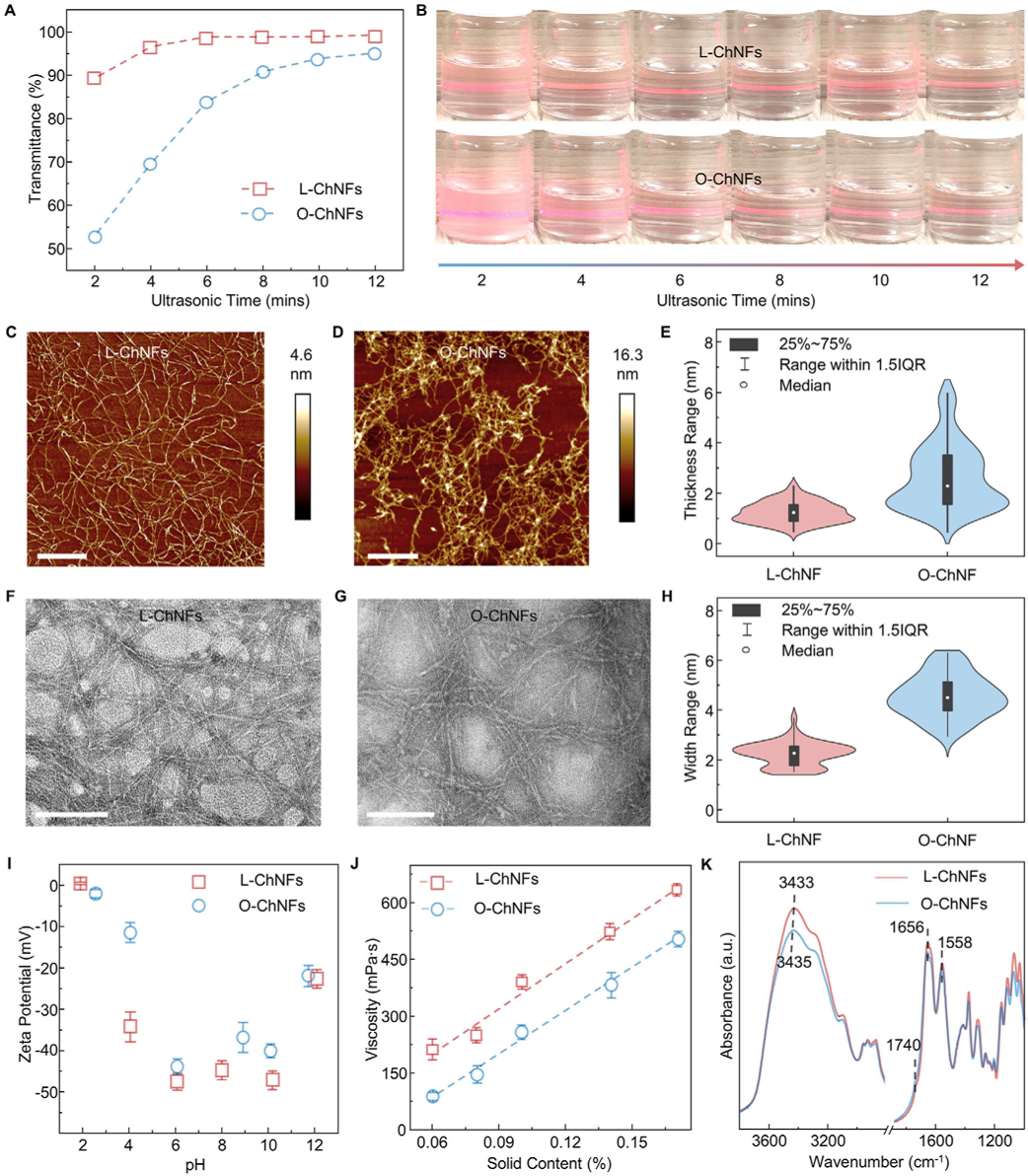 A,B) ChNFs悬浮液在不同超声间隔时间下的透射率A)和丁达尔效应B)。C,D) L-ChNFs C)和O-ChNFs D)的AFM图像(比例尺,1 μm)。E) 通过小提琴图对ChNF厚度分布的统计分析。F,G) L-ChNFs F)和O-ChNFs G)的TEM图像(比例尺,100 nm)。H) 通过小提琴图对ChNF宽度分布的统计分析。I) L-和O-ChNFs的Zeta电位及其相应的羧酸盐浓度。J) 不同浓度的L和O-ChNF悬浮液的粘度。K) L-和O-ChNFs的FTIR光谱。