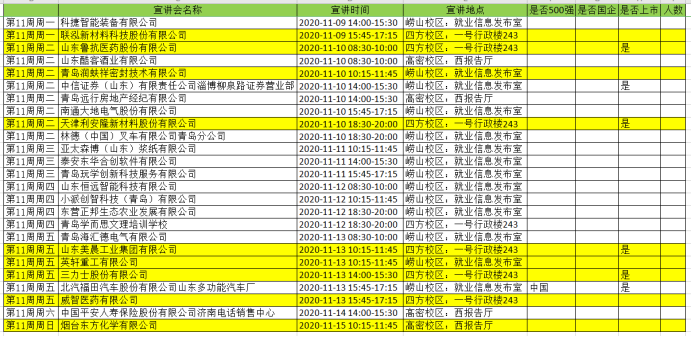 2020-2021学年第一学期第11周,进入公司进行校园宣讲招聘的企业名单如下,其中包含高分子材料专业相关(标底色)及不限专业的企业需求,请毕业生同学根据个人实际情况,按时参加企业宣讲会。