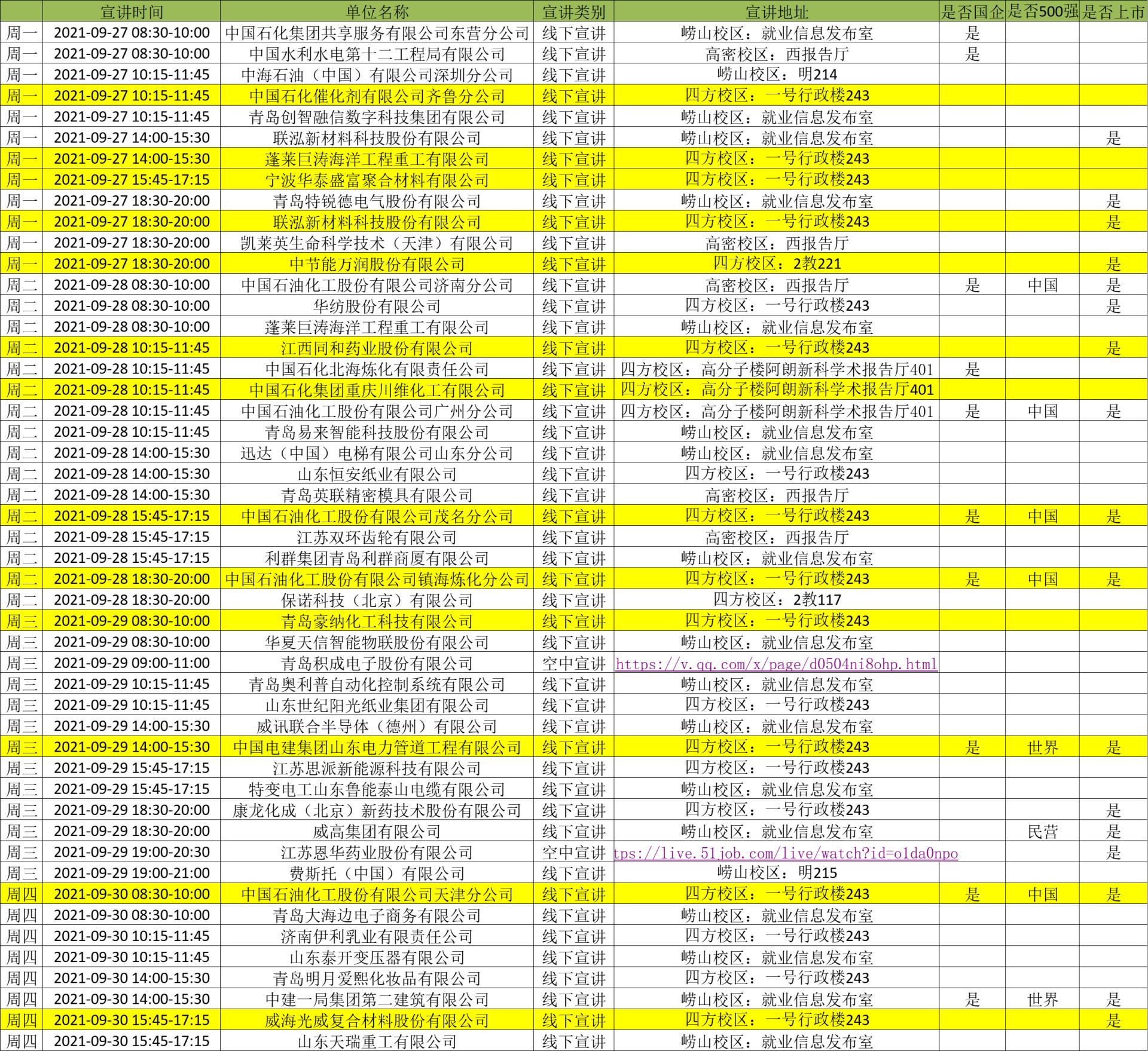 2021-2022学年第一学期第4周,进入公司进行校园宣讲招聘的企业名单如下,其中包含高分子材料专业相关(标底色)及不限专业的企业需求,请毕业生同学根据个人实际情况,按时参加企业宣讲会。