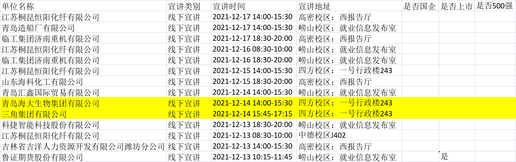 2022届硕士及本科毕业生: 2021-2022学年第一学期第16周,进入公司进行校园宣讲招聘的企业名单如下,其中包含高分子材料专业相关(标底色)及不限专业的企业需求,请毕业生同学根据个人实际情况,按时参加企业宣讲会。
