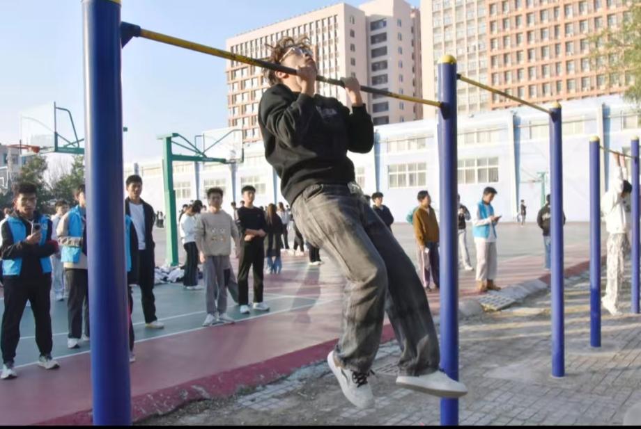 赛场之上,斗志昂扬。男生组队员紧握单杠,奋力上拉,用标准动作诠释坚持的力量;女生组队员平躺垫上,节奏稳定,以坚韧耐力展现青春风采。每一次起身、每一次上拉,都是对自我的超越,更是团队精神的凝聚。